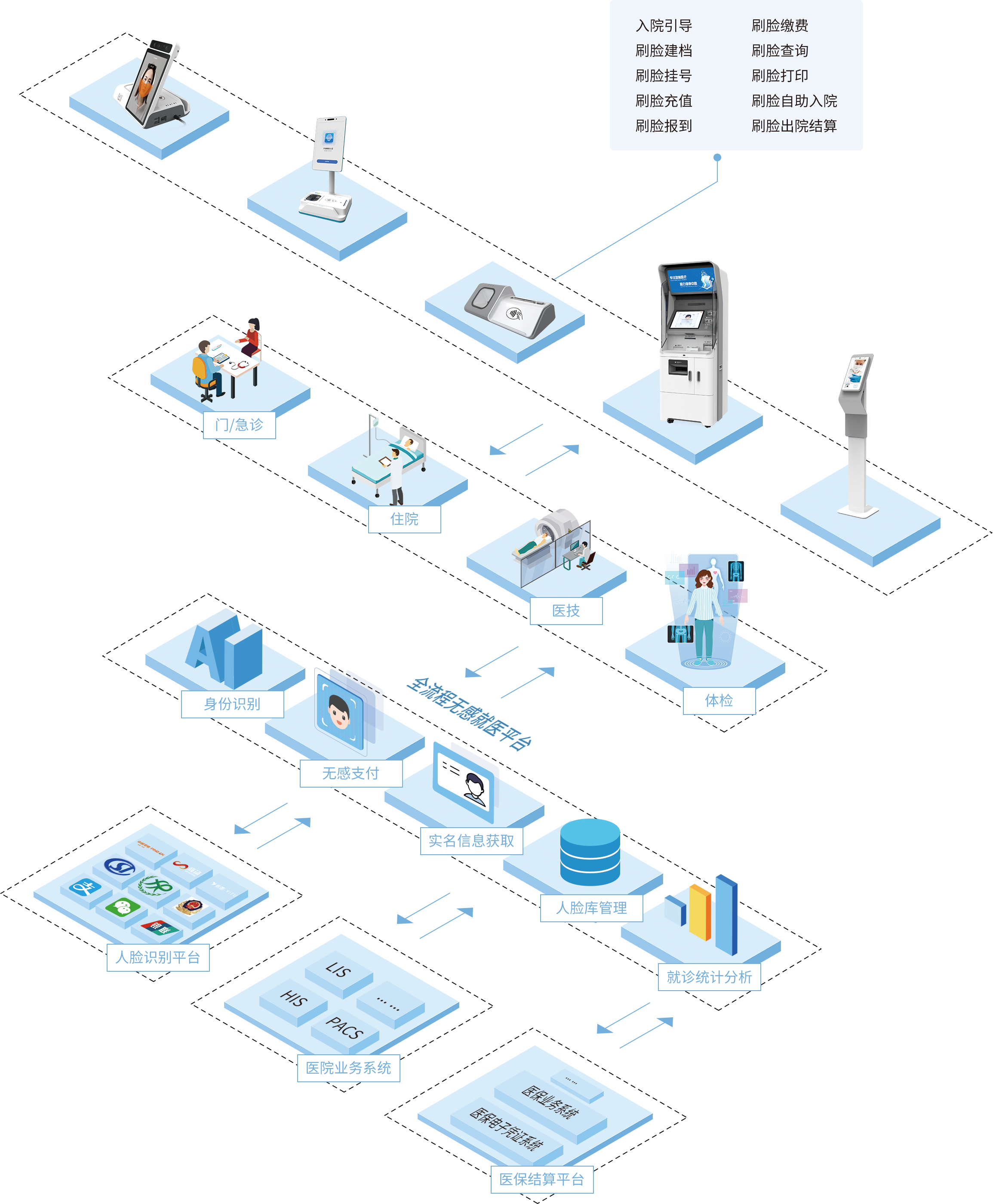 通過在門/急診區(qū)、住院部、藥房、醫(yī)技科室等部署智能終端設(shè)備,結(jié)合自主研發(fā)的服務(wù)系統(tǒng)軟件,將傳統(tǒng)的窗囗式服務(wù)工作遷移到信息設(shè)備中,實現(xiàn)了建檔、充值、掛號、繳費、查詢、打印等全流程一站式自助服務(wù),同時通過人臉、聚合碼方式對現(xiàn)有智慧就醫(yī)業(yè)務(wù)流程進(jìn)行升級,實現(xiàn)無感掛號、報到、充值、繳費、查詢、打印等功能,就醫(yī)場景全覆蓋,助力醫(yī)院打造非接觸式就醫(yī)服務(wù)體系。
